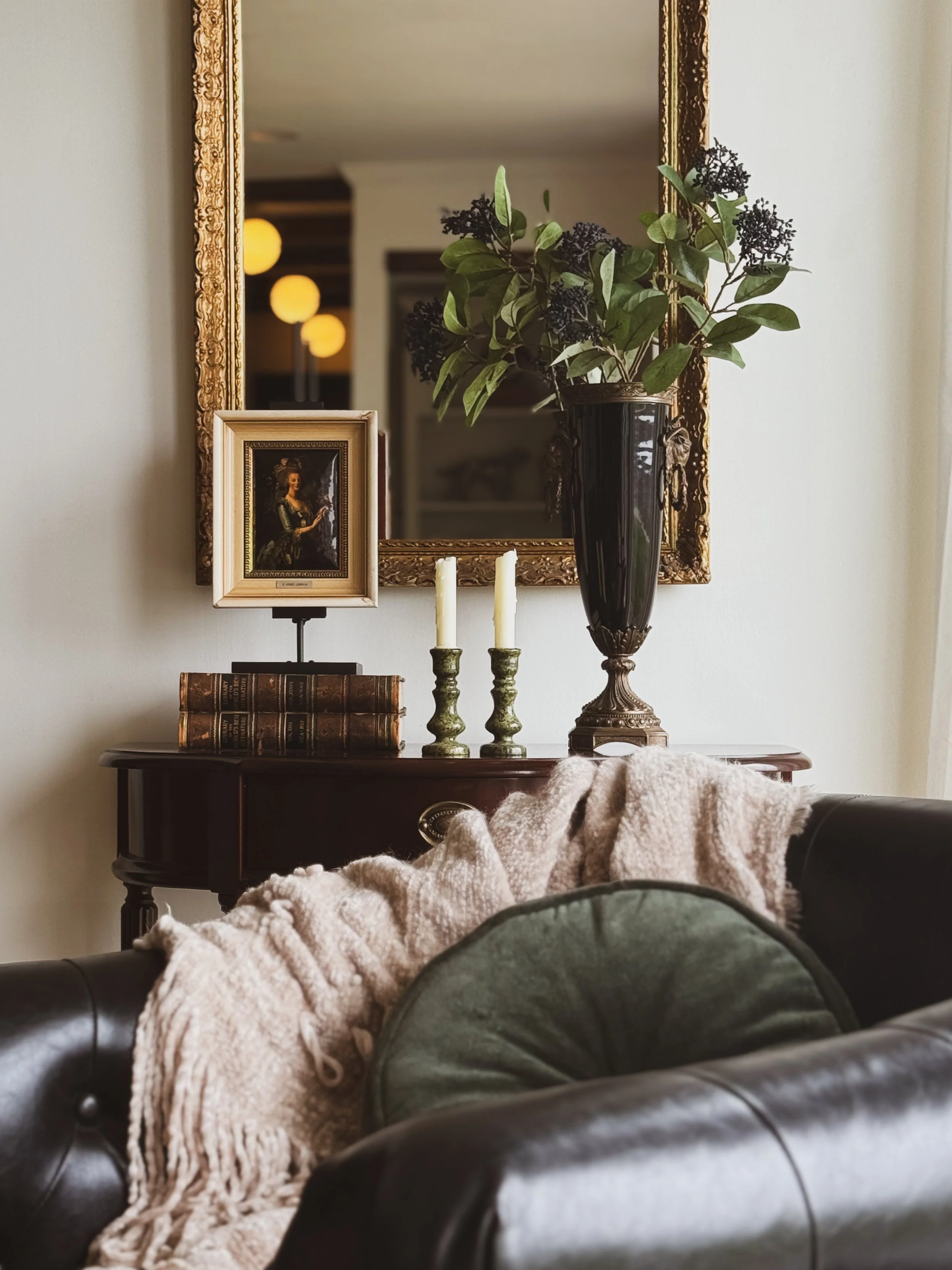 For a bit of contrast, try incorporating brighter green foliage or berry branches. They introduce a subtle sense of spring while still preserving a grounded, darker aesthetic as we’ve shown in the vignette above.