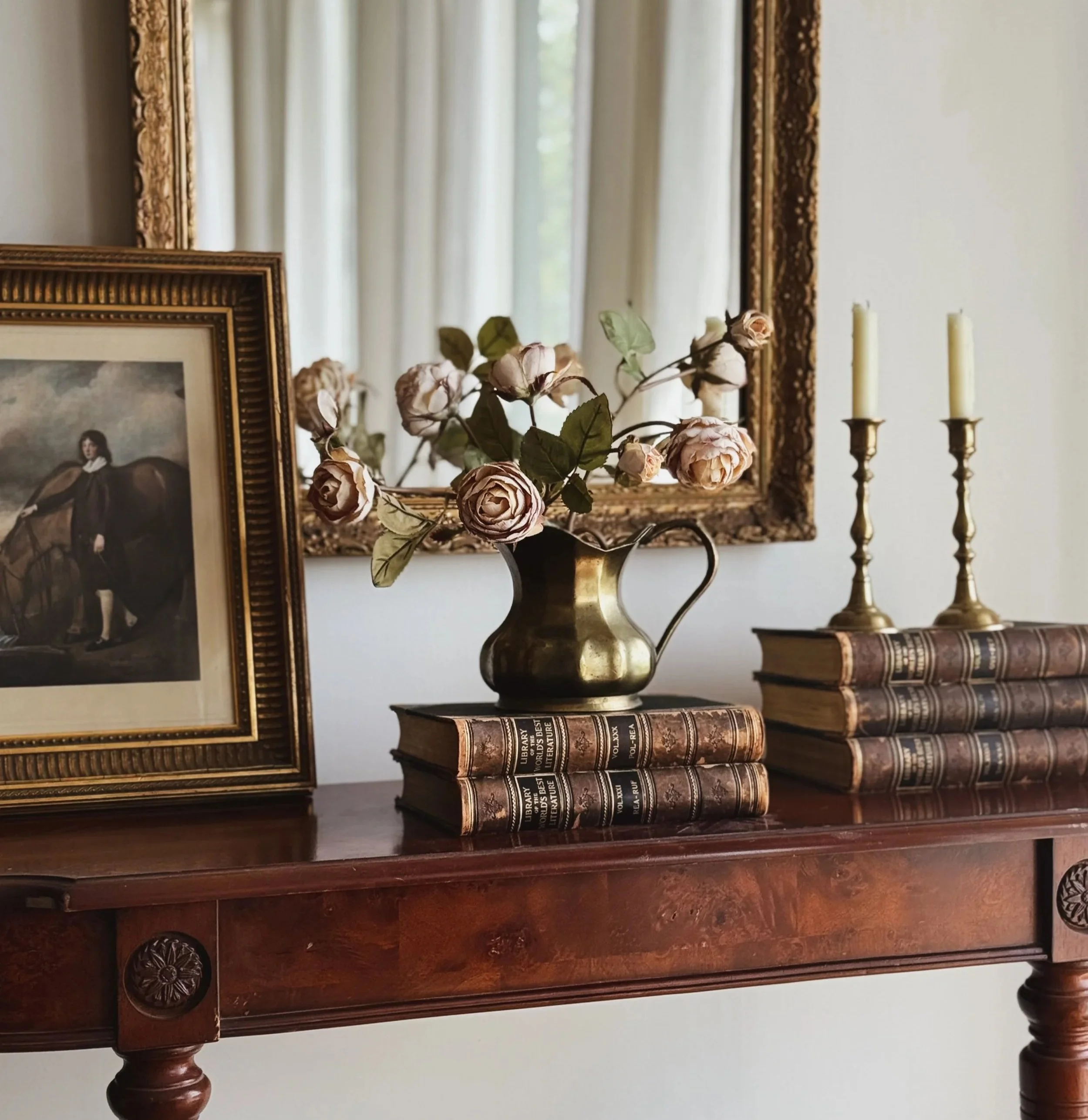 Warm Neutrals, Soft Florals, and a Touch of Earthy Blue in a Collected Interior Vignette