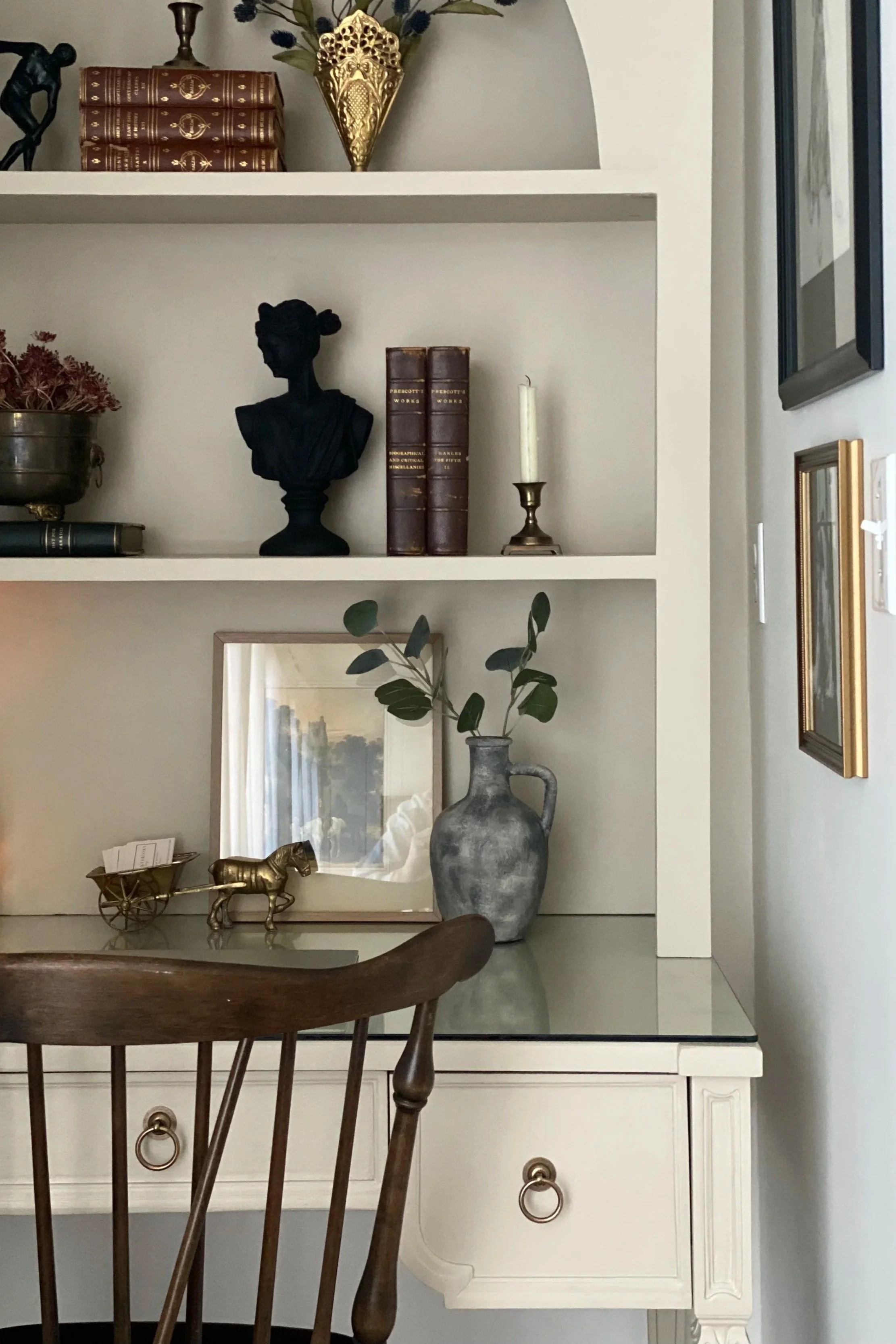 I loved styling my new office shelves with a few of my favorite vintage finds. They bring a beautiful lived in quality, and for me, nothing sparks creativity quite like being surrounded by well-loved vintage pieces.