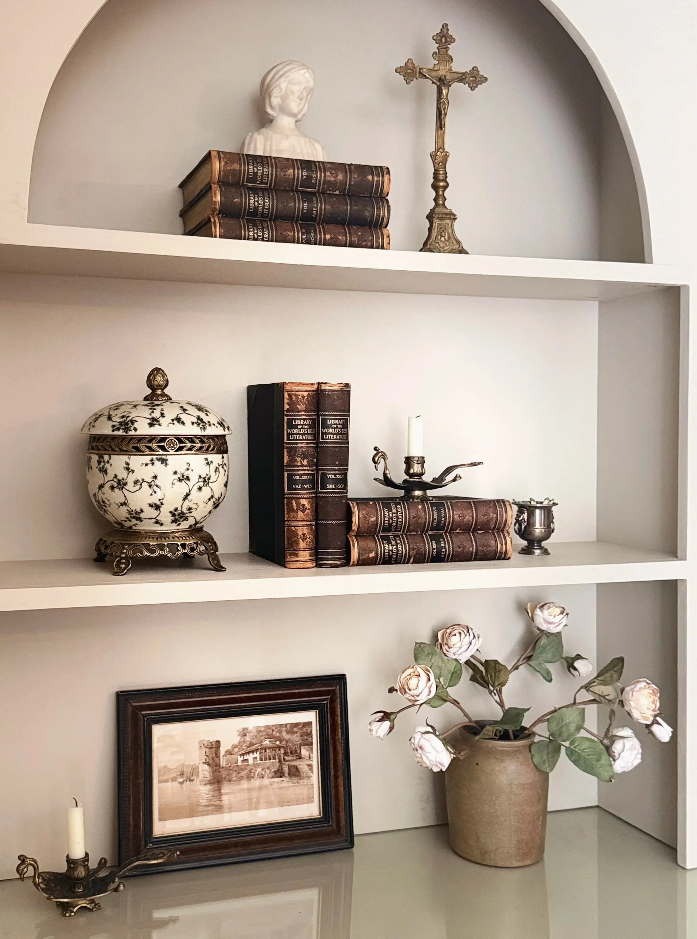 Finally, to complete the bookshelf, I incorporated an Italian Sculpture and layered in volumes from our Library of the World’s Best Literature collection. The white alabaster sculpture brings a lightness that feels beautiful for spring while still maintaining a classic presence. The books introduce height and structure, breaking up the sculptural elements and creating a more balanced, collected feel.