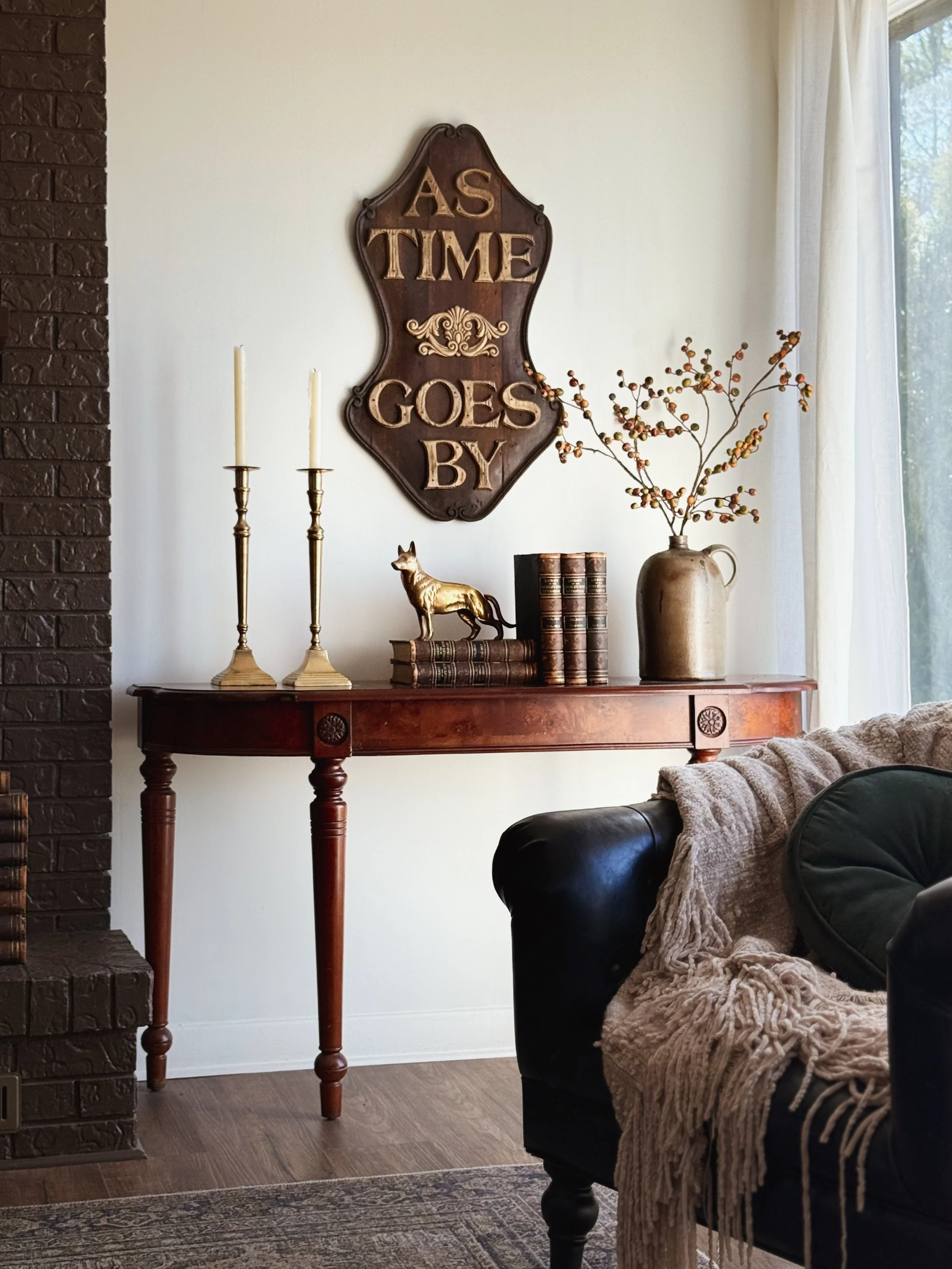This charming Vintage Wood "As Time Goes By" Wall Plaque sets the tone for the entire look, bringing warmth, nostalgia, and quiet character to the space.