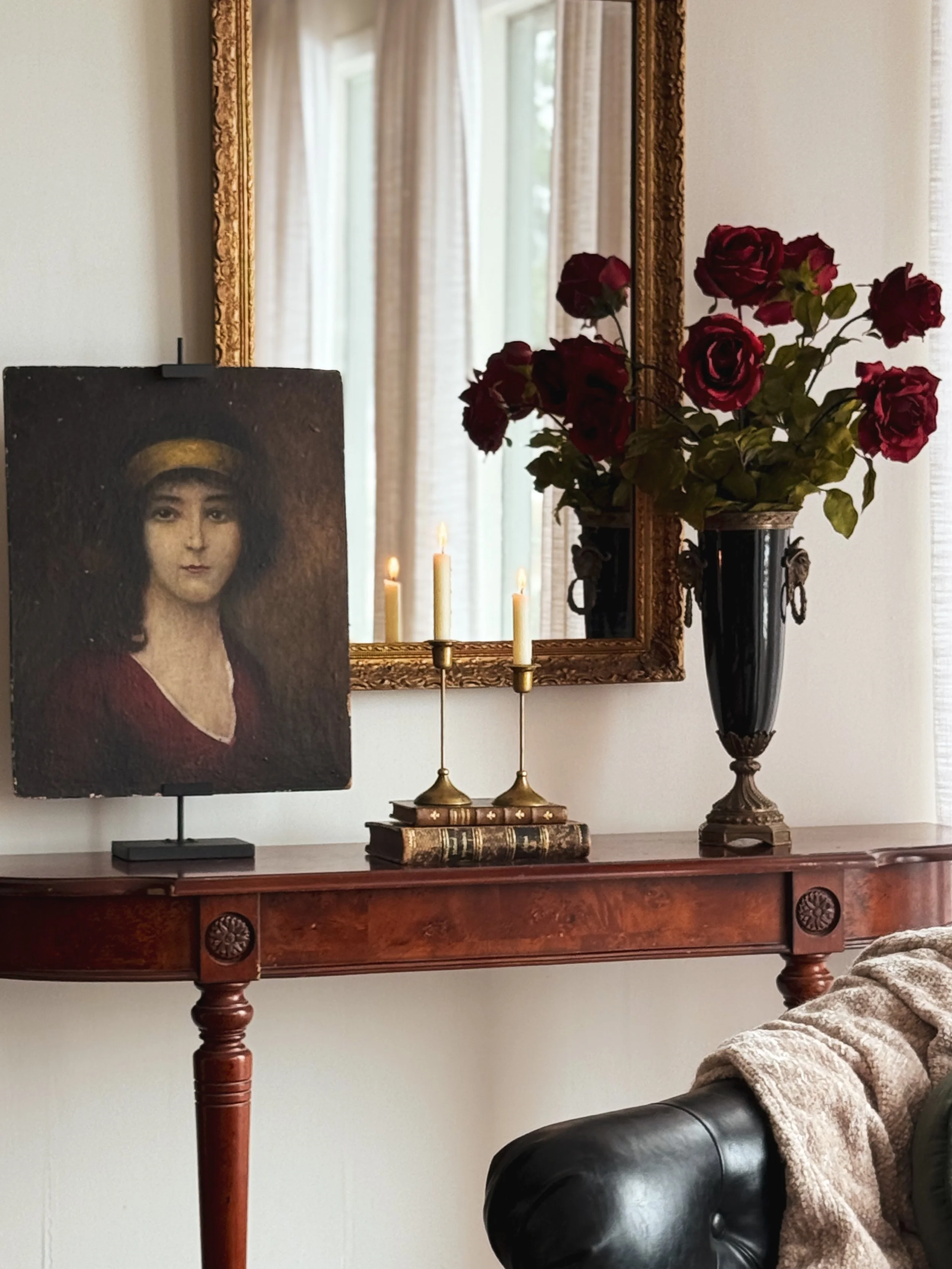The artwork is what truly sparked this entire vignette. Sourced recently during one of our buying trips, this original antique oil painting is, without question, one of my personal favorite finds to date.