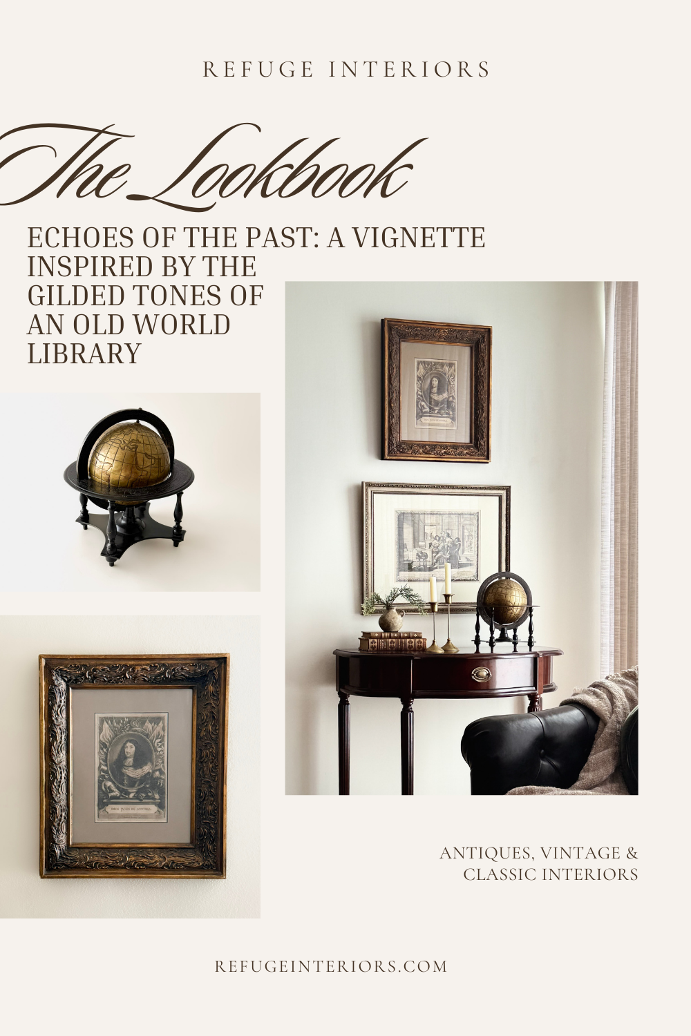 While our dream library hasn’t yet come to life, the vision remains firmly rooted. This latest vignette brings a small-scale interpretation of that dream into focus. Though simplified, the look draws from a deep appreciation for old-world libraries and the sense of history, richness, and quiet romance they evoke. It’s a nod to spaces shaped by time—where warm textures, aged finishes, and collected objects come together to tell a story that feels both personal and enduring.