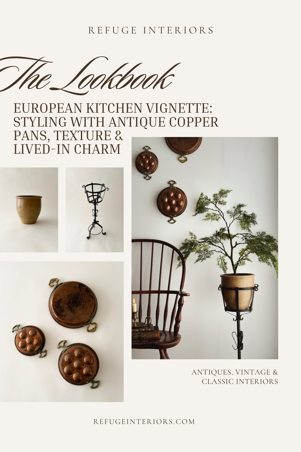 European Kitchen Vignette: Styling with Antique Copper pans, Texture & Lived-In Charm
