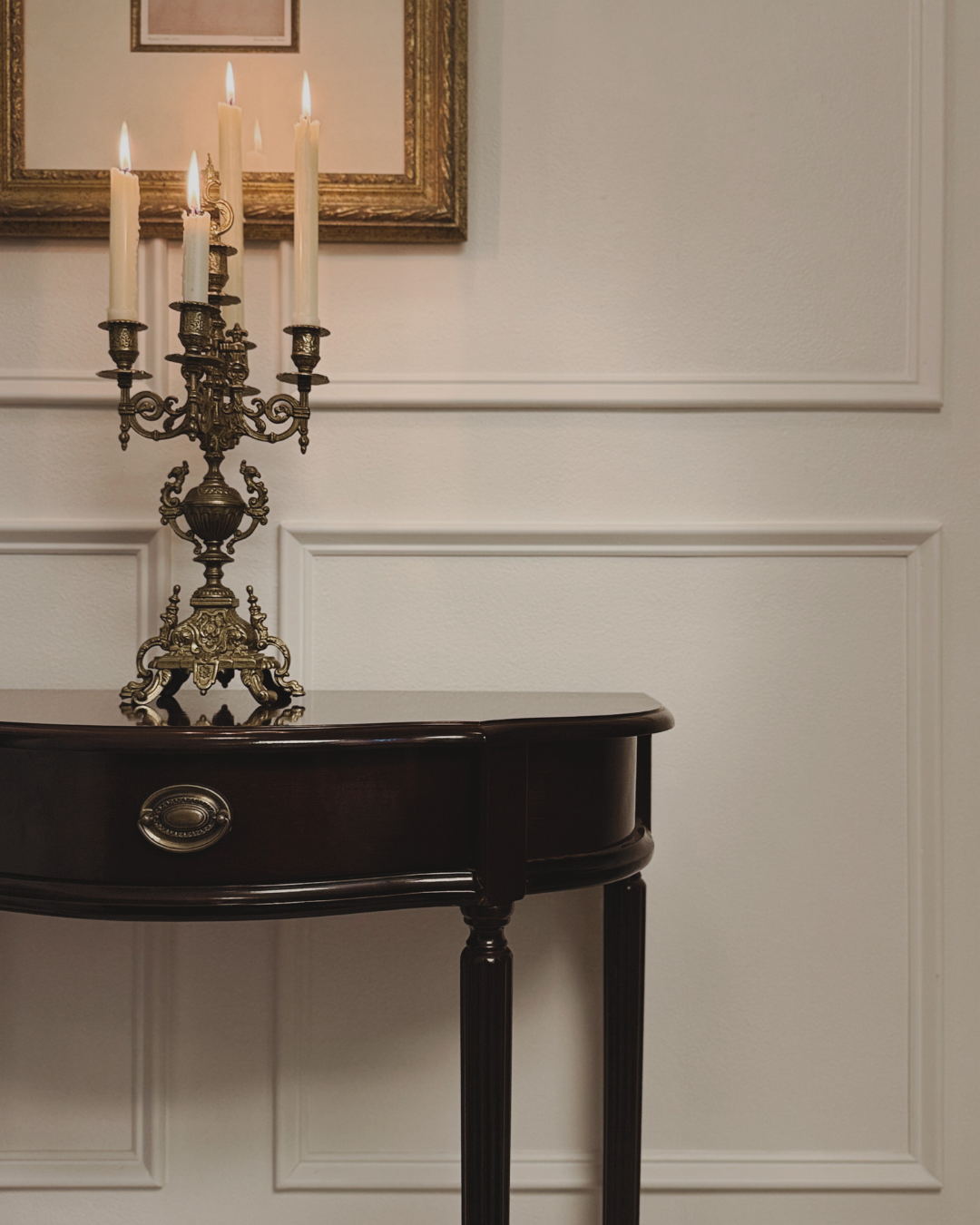 Rather than layering multiple ornate elements into the vignette, we allowed the sculptural silhouette of the candelabra to remain the undeniable focal point.